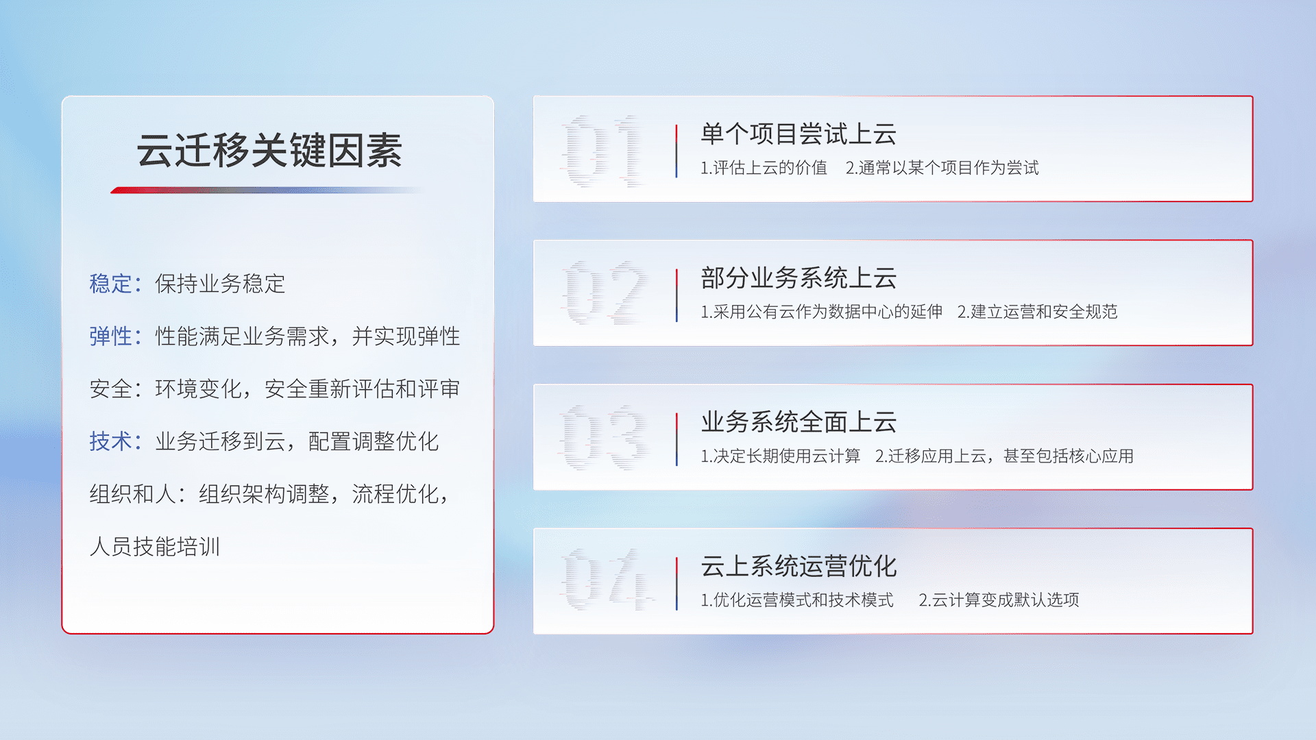结合实际业务,,,,从规划设计、、、云平台选型、、、、云原生改造、、、、数据迁移、、集成交付,,,,迁移全过程为客户识别最佳上云路径,,,,做好风险识别管理,,,,设计网络架构、、、身份权限、、、、安全审计合规、、、操作审计、、日志审计、、、监控告警策略、、、多站点容灾设计等,,,对云上基础设施进行整体规划,,提升IT治理水平,,以满足弹性、、高可用、、、高性能的需求。。。